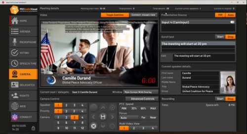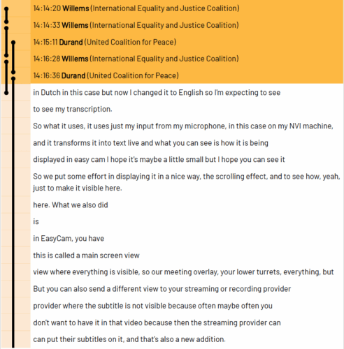 Een andere belangrijke toevoeging is onze nieuwe transcriptiemodule. Deze brengt realtime ondertiteling en volledige transcriptie van vergaderingen rechtstreeks naar uw eigen infrastructuur, wat betekent: geen afhankelijkheid van de cloud, geen externe verwerking. Ondertiteling wordt vloeiend weergegeven in EasyCam en operators kunnen tegelijkertijd een versie met en zonder ondertiteling uitvoeren, wat ideaal is wanneer streamingplatforms hun eigen ondertiteling genereren.
